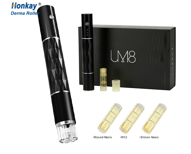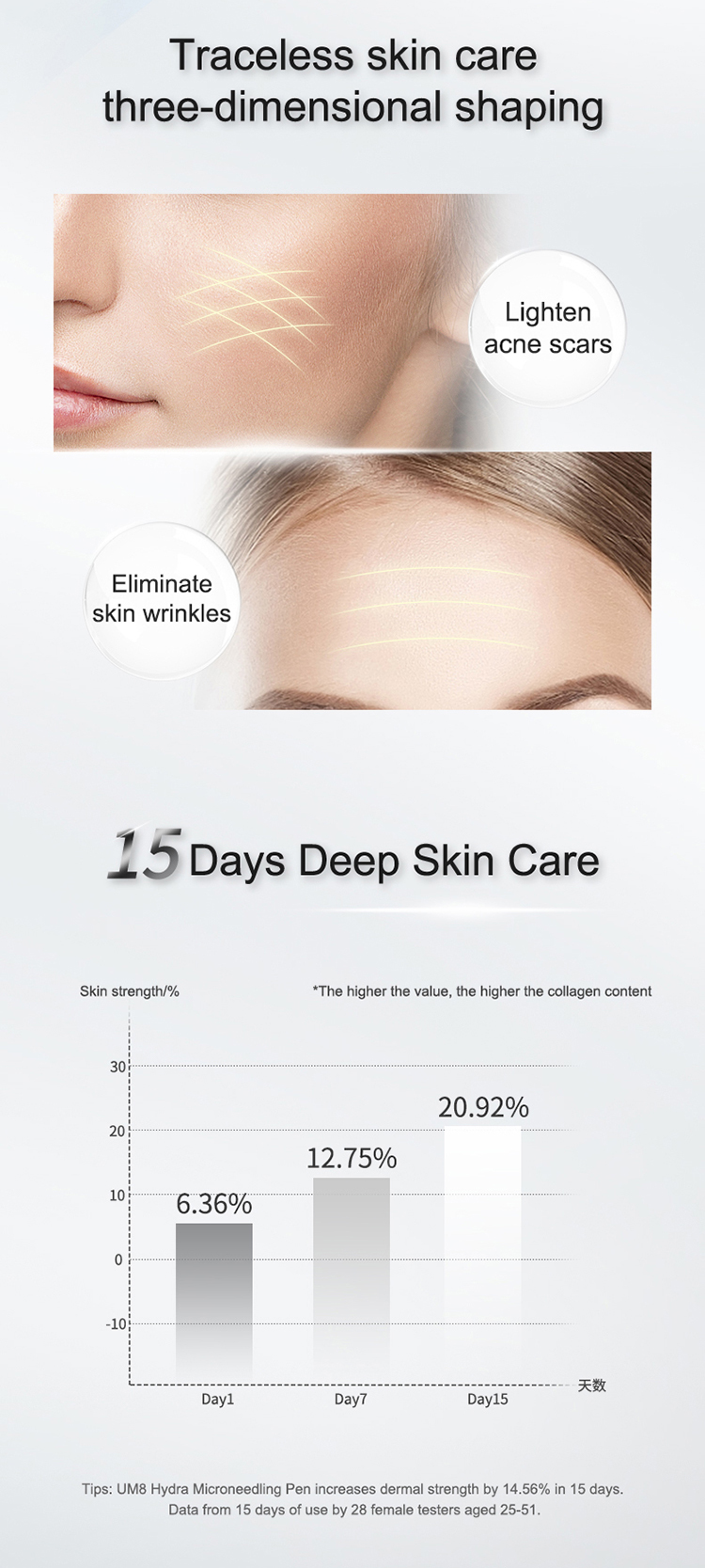 Hydra Microneedling Pen UM8 uses nano-scale microneedles to create tiny channels on the surface of the skin, stimulating the skin's natural repair mechanism. It also adds 3ml of liquid to promote the production of collagen and elastic fibers, thereby improving the elasticity and firmness of the skin.